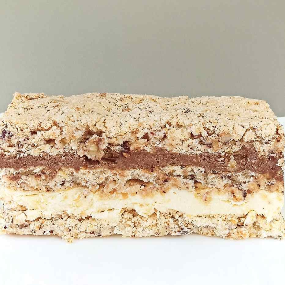 Песочные коржи, сливочно-сметанный крем, грецкие орехи.